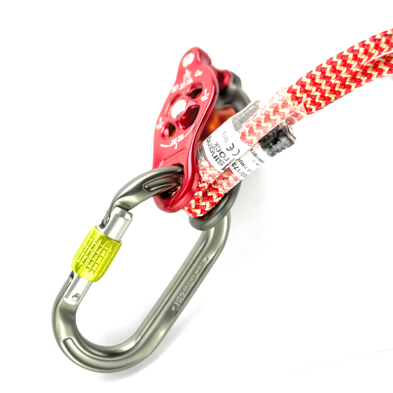 - in den Steg lassen sich - während das Seil eingelegt ist - weitere Karabiner einhängen, etwa für einen Flaschenzug, Prusik-Rücklaufsperren, oder beim Kurzseil als Aufnahme für das rücklaufende Seilende. Dieses Feature macht die Pinto Rolle einzigartig
