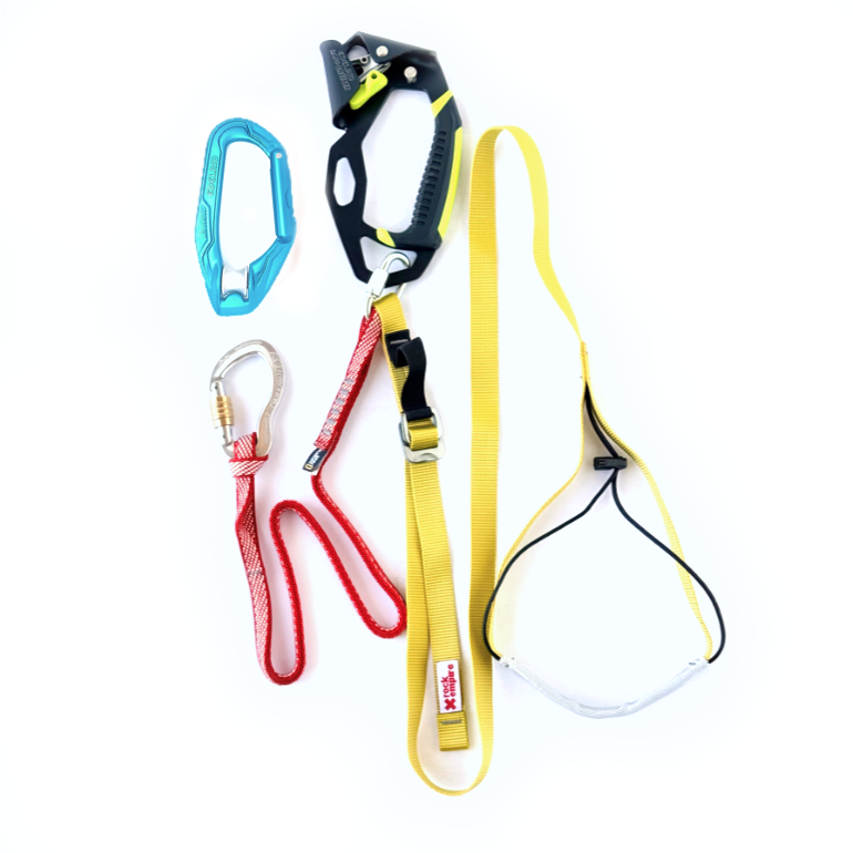 - fertiges Set für den Aufstieg am Seil, bestehend aus Handsteigklemme, Umlenkkarabiner mit eingebauter Rolle, Fußschlaufe und Gurtsicherung